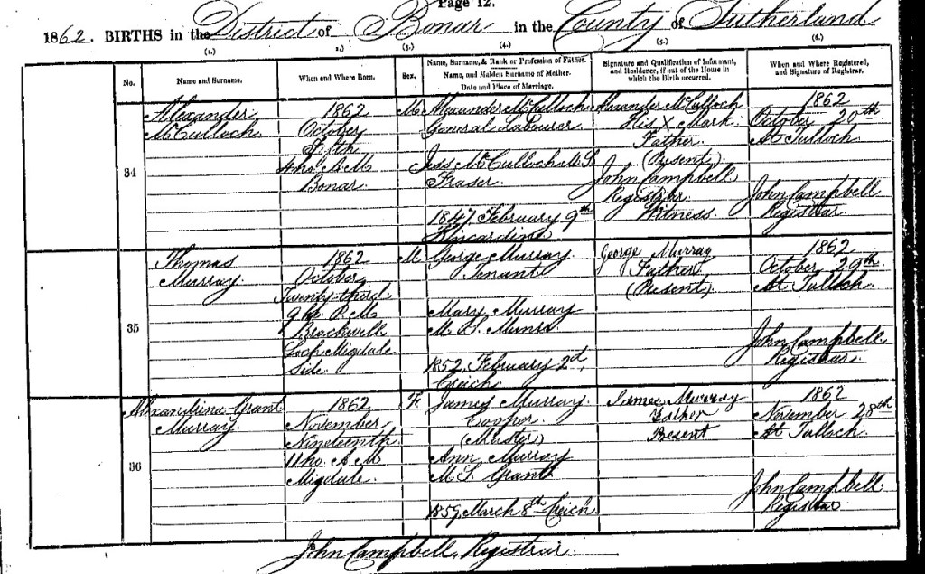 Birth Record for Alexander McCulloch 1862 Bonar , Sutherland