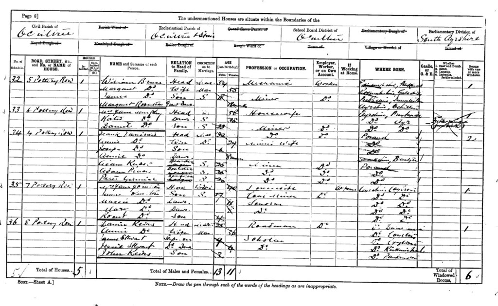 In 1891, Thomas was employed as a Crane Man, living in Prestwick, and John was a General Labourer, and Philip was a Fireman, manning a Stationary Engine. These two brothers were living in Rankinston, a small mining village in the shadow of Polquhairn Colliery. The colliery was owned by The Polquhairn Coal Company. It was a small village consisting of 148 houses arranged in rows of twenty at the top end. The cottages were owned by the Glengarnock Iron and Steel Co.