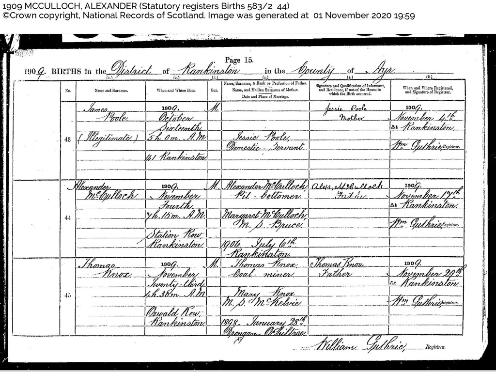 On his arrival in Ayrshire, Alexander found work in the colliery and, in 1901, he was employed as a Pit Sinker. He was boarding with the McCaskill family at No 41 Rankinston. He was 38 and still a bachelor. His brothers John and Philip were also living in Rankinston. John lived at 114 Craig View Cottages and was a Char Contractor (Cleaning Contractor). Philip was married and was living at No 96 Rankinston. He was working as a Pit Bottomer.