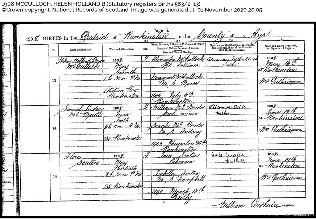 Briefly, I am a grandson of Helen Holland Bruce McCulloch, born to Alexander McCulloch and Margaret Bruce on May 7th, 1908 —she was their first daughter together. She emigrated to Canada in 1930, where she married and raised five sons, three of whom are still alive (now in their eighties). I directed my uncles to your website, and they were delighted to read through your detailed accounts.