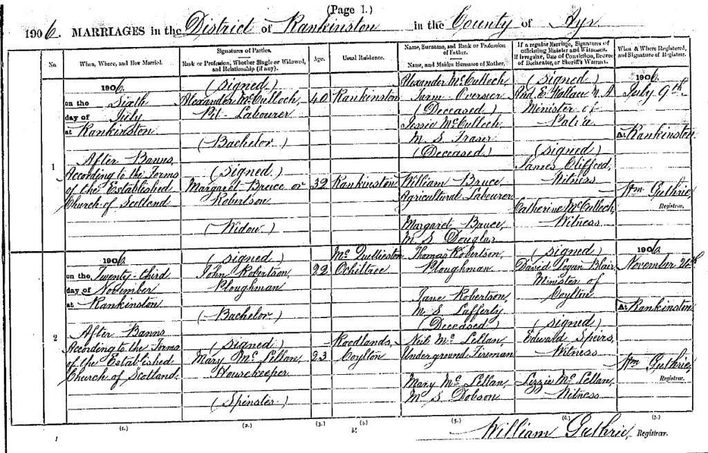 Marriage of Alexander McCulloch to Maggie Bruce 1906 Rankinston