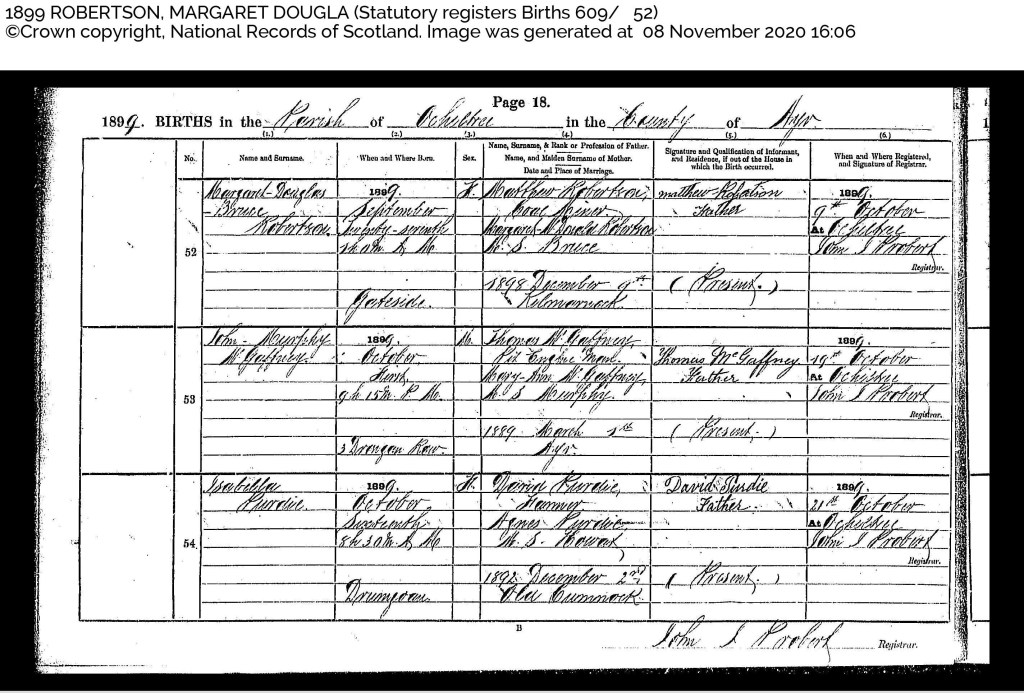Matthew had lived in Ochiltree when he was married before and had probably worked in the mines there, so after they married, he and Maggie settled in Ochiltree. They lived at 1 Drongan and in Sept 1899, Maggie gave birth to their first child, a daughter, Margaret Douglas Robertson, named after Maggie’s mother.