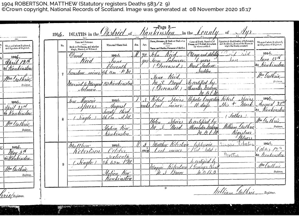 Two years later Maggie and Matthew had moved 2 miles further down the Littlemill Road to Rankinston. On the 1st of July 1903, Maggie gave birth to another daughter, named Sarah Nicol Robertson after Matthew’s mother. By 1904, they were living in Station Row in the village. Matthew was working as a Bencher in the nearby pit.
