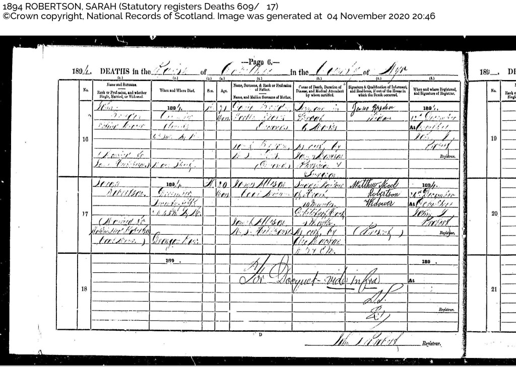 Matthew lay at home for six months before he died. I can only imagine how awful this would have been. Maggie would have had no medical training and, with Matthew unable to work no income. It is probably significant that Matthew died in early January. The winter months and the cold weather in rural Ayrshire would have been harsh. Money would have been hard to come by as there would have been no financial support for the family after his accident. Food and heating may have been scarce. Did he waste away? In the end, his death might have come as a relief. He was just 34 years old.