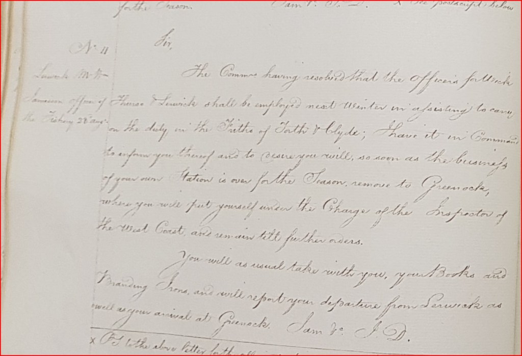 When business was quiet in Lerwick William was sometimes called upon to help out at other fisheries. In 1813, he and the Fishery Officer for Thurso were directed by the Board to proceed to Greenock on the Firth of Clyde. As soon as their own season was finished.