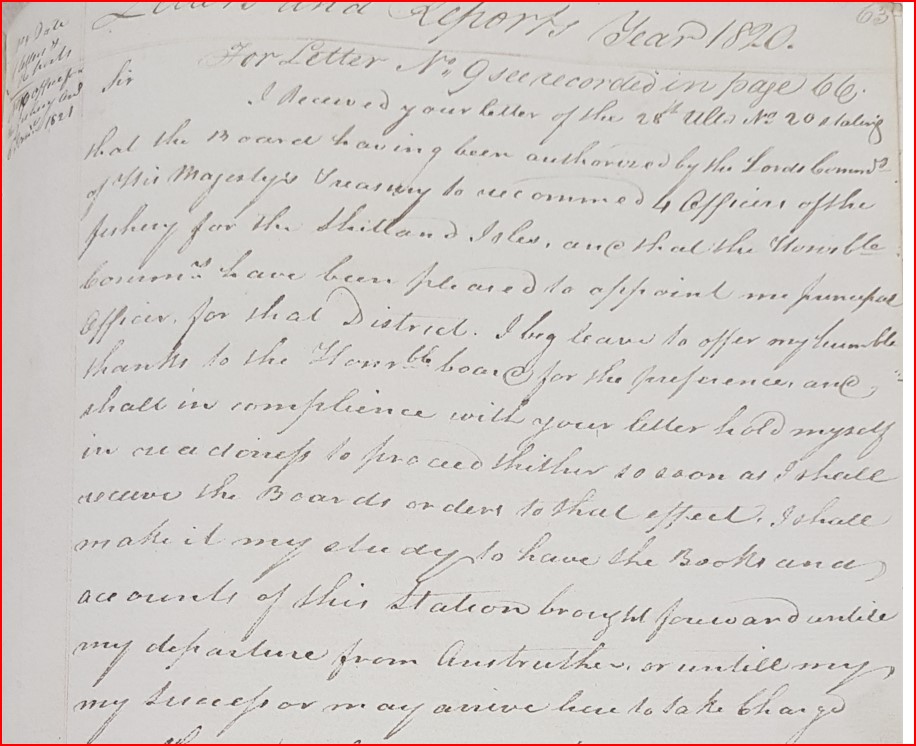 ‘Sir, I received your letter of the 28th ulto No.20 stating that the board having been authorised by the Lords Commissioners of his Majesty’s Treasury to recommend 4 Officers of the Fishery for the Shetland Isles and that the Honourable Commissioners have been pleased to appoint me Principal Office for that District. I beg leave to offer my humble thanks to the Honourable Board for the preference and shall in compliance with your letter hold myself in …ness to proceed thither so soon as I shall receive the board’s orders to that effect. I shall make it my study to have the books and accounts of this station to be brought forward until my departure from Anstruther, or until my successor may arrive here to take charge.‘ William Jamieson 1821