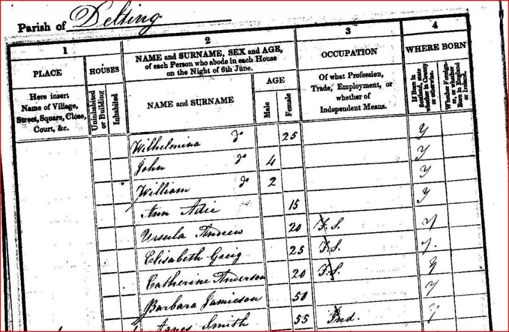 Barbara was not present in the home at that time the census was taken, June 1841. This was because she was at the home of her daughter, Williamina, in Hillend, in Delting. She may have been visiting Williamina following the birth of her latest baby, Anne Innes Adie, who had been born in April that year.
