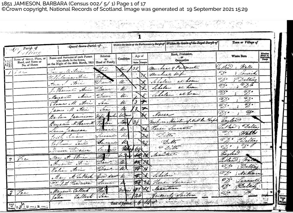 The census also shows that William and Barbara employed two female servants, Elizabeth Dabister, 40, and Lilias Cogle, 15.