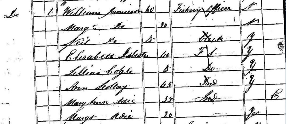 Williamina’s mother-in-law, Margaret Ann Adie, 55, and her sister in law, Margaret Adie, 20, were in the house on Main Street on the day of the census.
