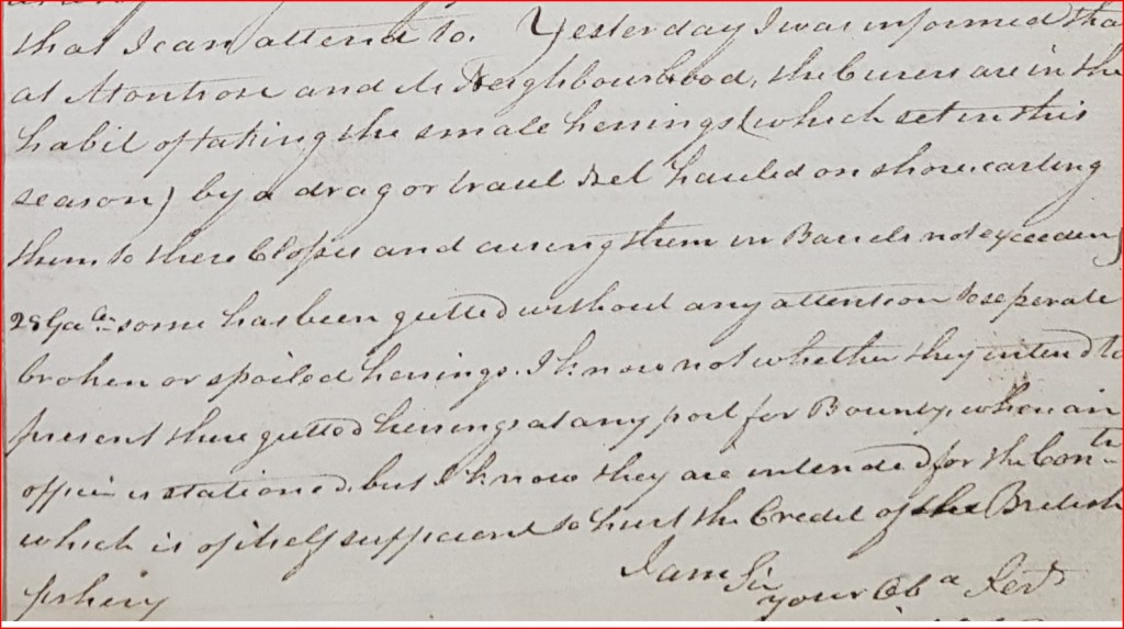 ‘…If I had to be here and to employ men occasionally so as to go amongst the fleet, when their nets are shot, it would be the effectual way to put a stop to them. men could be got here and the curers are very desirous that such should take place. I shall leave this matter for the Honourable Board to determine. in the meantime, I shall exert myself to the utmost of my power to detect nets of illegal size if they come under my eye.’ William Jamieson 1817