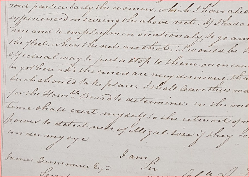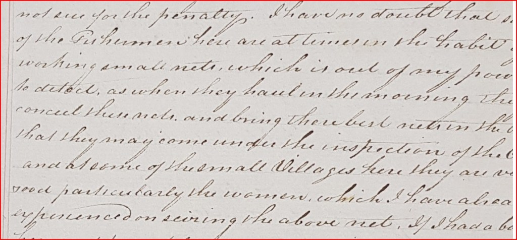 ‘ … I have no doubt that some of the fishermen here are at times in the habit of working small nets, which is out of my power to detect, as when they haul in the morning they conceal the nets, and bring their best nets in the care that they may come under the inspection of the office, and at some of the small villages where they are very rood, particularly the women, which I have already experienced on seizing the above net…‘ William Jamieson Officer of the fishery