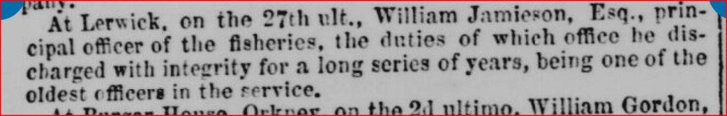 The herring fishery did recover in Shetland but not until the 1880s but William did not live to see it. He died on the 27th of May 1847 at the age of 79. He had worked for the Fishery Board since its beginnings and this was recognised in his obituary which appeared in the Greenock Advertiser on the 6th June 1848.
