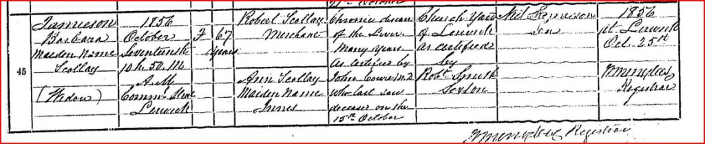 Robert left an annuity of £40 a year for Barbara and £200 for her eldest daughter, Ann Innes Jamieson. She received this on her 21st birthday. William and Barbara’s other children were also provided for and would receive an equal share of the remainder of his estate.