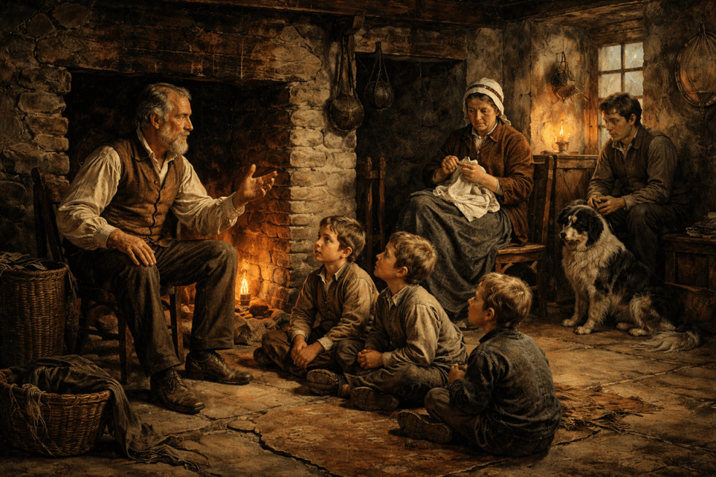 When the day’s work was done, another kind of learning unfolded. As the light faded behind the hills and the wind pressed against the walls of the croft, the family settled around the hearth. The small, steady glow of the fire provided dim light. The boys huddled where they could find warmth, ready to listen. Stories spoken in Gaelic, told sparingly, offered almost in passing, carried fragments of memory, old tales handed down from one generation to the next.