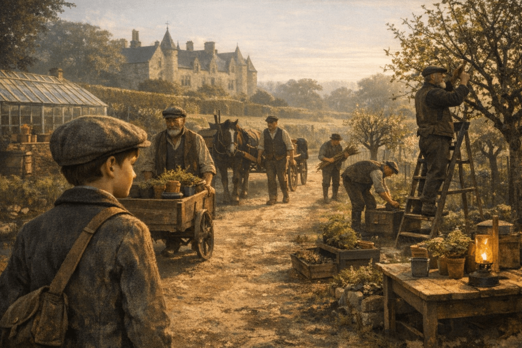 On his way to school, he sometimes passed these men on the road, their carts filled with soil or cuttings, their jackets dusty from the potting sheds. Their tasks were different from the farms, more deliberate, more ordered. Some were older men trained on other estates; others were apprentices learning to prune fruit trees, raise seedlings, and keep the ornamental grounds in good condition. Alexander noticed their steadiness, the quiet concentration that set them apart.