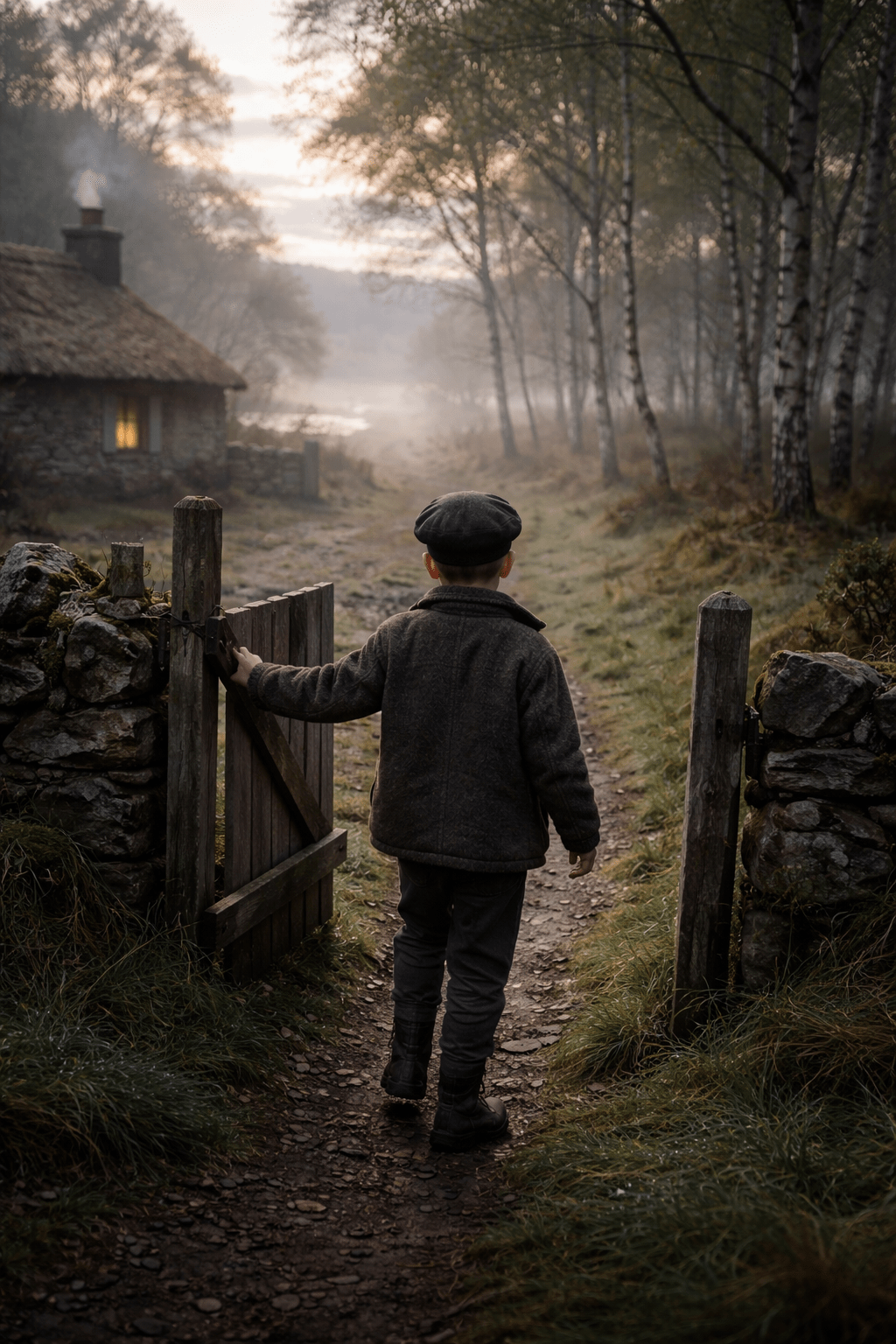 At the northern edge of Scotland, a small boy steps into the first light of day. The air carries peat smoke and sea salt, the sun low over the Dornoch Firth. Behind him, a cottage door closes softly.