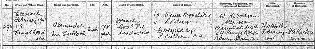 Alexander died in Birmingham on 11 February 1941, aged seventy‑nine. The death certificate recorded the address on King’s Road and named W. Robertson, his stepson, as the informant. It was a quiet end, far from the birch woods of Creich where he had been born, far from the pits of Ayrshire where he had spent the prime of his life, and far from the house in Ferniegair where he had raised his children.