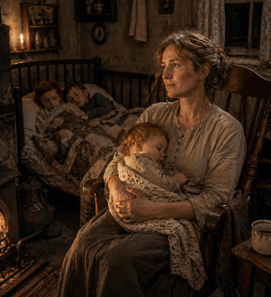 She learned to move him with a strength she did not know she possessed. She carried water from the pump, heated it in the blackened kettle, and bathed him as best she could. She kept the children quiet when the pain was bad, and when he slept, she sat beside him simply watching the rise and fall of his breath.