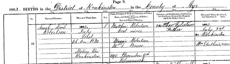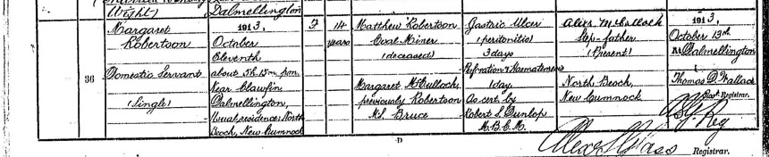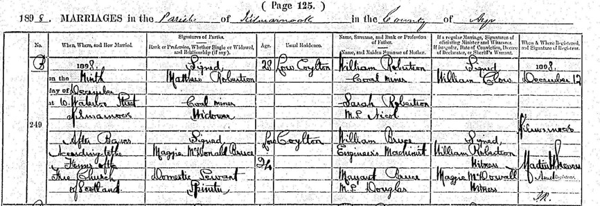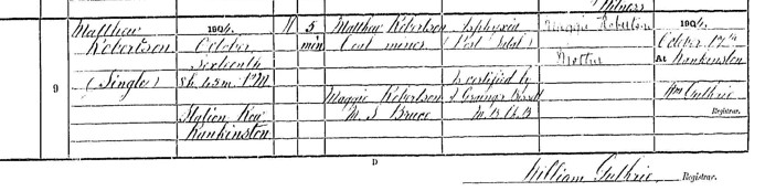 It was in this new landscape of mills and mining villages that Maggie met Matthew Robertson, a coal miner from New Cumnock. He was a widower; his first wife, Sarah Allison, had died of heart failure only two years after their marriage in 1892. Their union had not produced children.
