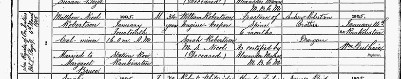 The official record of Matthew’s death is stark in its language, but for Maggie it marked the end of a long, slow unravelling that had begun the previous summer. On 14 January 1905, at one o’clock in the morning, Matthew Nicol Robertson died in their small cottage on Station Row. The registrar wrote the details in a steady hand, male, thirty-four, married to Margaret Bruce, cause of death: fracture of spine, six months’ duration, but the words could not capture the months of pain, fear, and quiet endurance that had preceded that moment. His brother Andrew travelled from Drongan to give the information, sparing Maggie the ordeal of standing before the registrar herself.