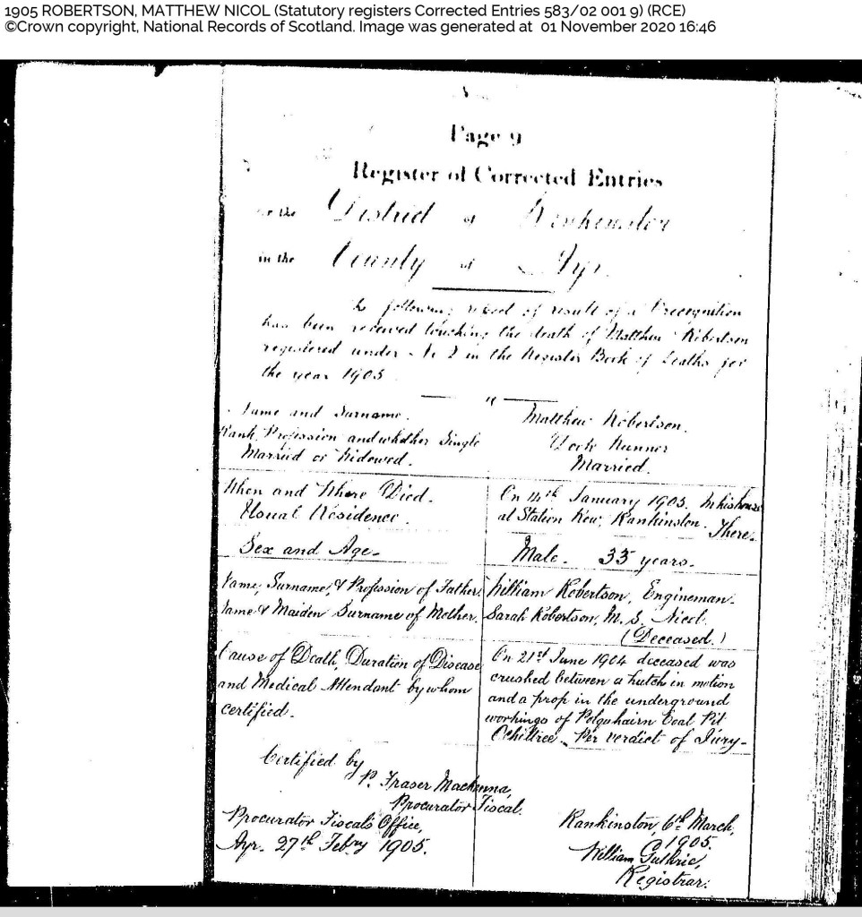 Weeks later, the Register of Corrected Entries added a colder, more forensic layer to the story. The Procurator Fiscal’s inquiry confirmed what the village already knew: that on 21 June 1904, Matthew had been crushed between a moving hutch and a pit prop in the underground workings of Polquhairn Colliery. A jury recorded the circumstances; officials signed their names; the correction was entered on 6 March 1905. It was all precise, tidy, and final.